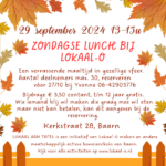 Kom genieten van een heerlijke zondagse lunchmaaltijd in een gezellige en ontspannen sfeer. Het aantal deelnemers is maximaal 30. Zonder reservering kan helaas niemand mee-eten. Aanmelden kan tot 27 september bij Yvonne, bel of app: 06-42903776 Kosten 3,50 euro, ter plekke te betalen (kinderen t/m 12 jaar gratis). Wie iemand blij wil maken die graag […]