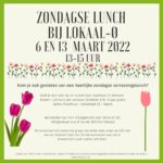 Kom je ook genieten van een heerlijke zondagse lunchmaaltijd in een gezellige en ontspannen sfeer? Dat kan op 6 en 13 maart van 13 tot 15 uur bij Lokaal-O. Kosten 3,50 euro, ter plekke te betalen (kinderen t/m 12 jaar gratis). Het aantal deelnemers is maximaal 25, dus geef je snel op. Zonder aanmelding kan […]